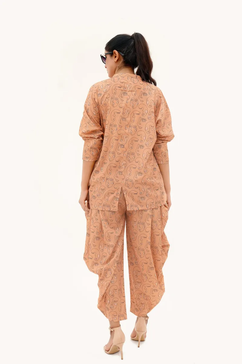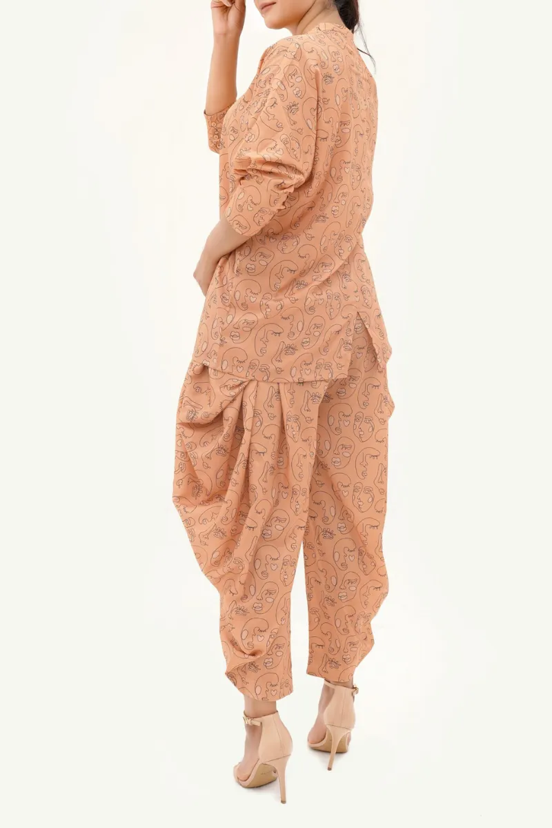 Echo reimagines traditional silhouettes through a modern lens. This matching set, in a soft peach tone, features a short-length shirt paired with contemporary shalwar-style trousers that offer both grace and comfort. The fluid form of the pants is balanced by the simplicity of the shirt, making it a refined yet effortless choice for work or day-out ensembles. With practical side pockets and an airy silhouette, Echo reflects a quiet boldness — a whisper of tradition, redefined for today.
