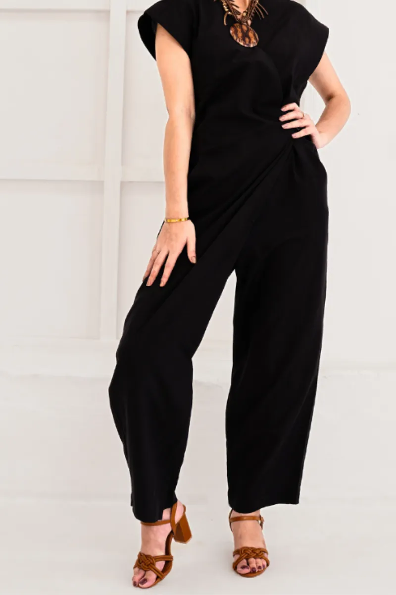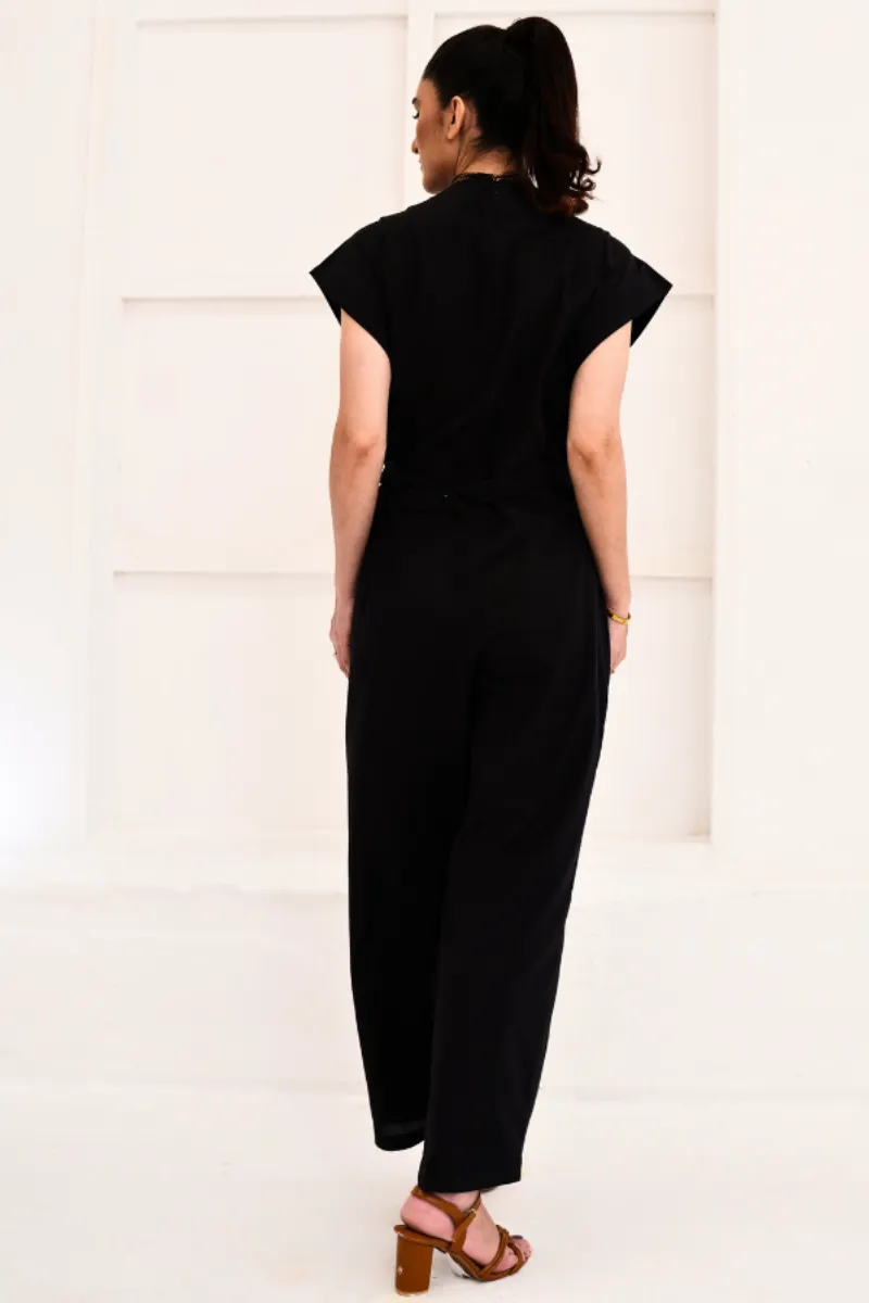 A modern reinvention of timeless elegance—our Ember jumpsuit is designed for effortless sophistication. Cut from handwoven 100% cotton, this sleek black jumpsuit features a sleeveless design and a tailored silhouette that cinches at the waist for a flattering fit. The structured bodice is meticulously shaped with princess seams, while the tapered trousers offer a streamlined finish. Precision stitching ensures a seamless drape, while the structured yet fluid cut makes it a versatile piece for any occasion. Pair with statement heels and bold accessories for a look that speaks confidence.