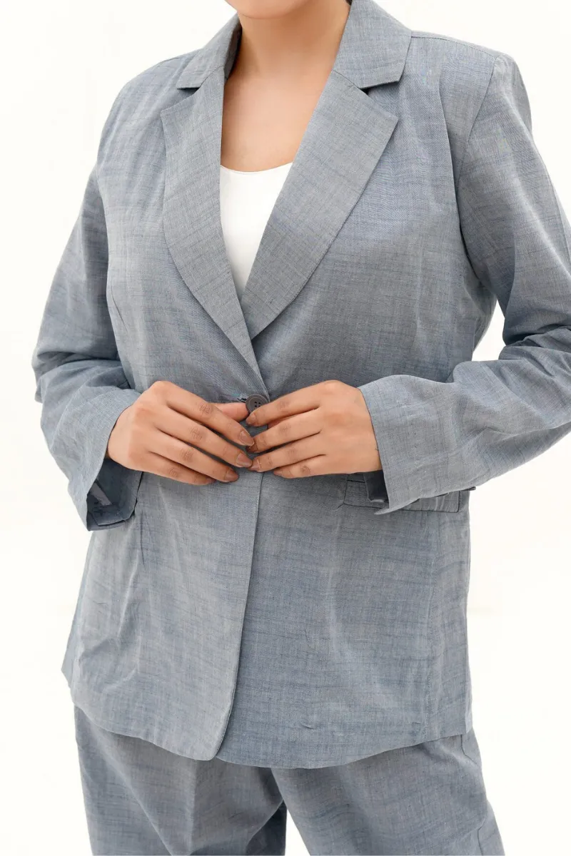 Lattice is your power suit reimagined — expertly tailored for ease and presence. In a soft yet striking light blue, this matching set features a structured coat and straight-cut trousers crafted from breathable fabric that keeps you comfortable all day. Designed to frame your presence with subtle confidence, Lattice transitions effortlessly from boardroom to evening with sharp, polished style. Whether layered over a tank or worn alone, it’s a statement of gentle strength and refined professionalism, empowering you to shape your day on your terms.