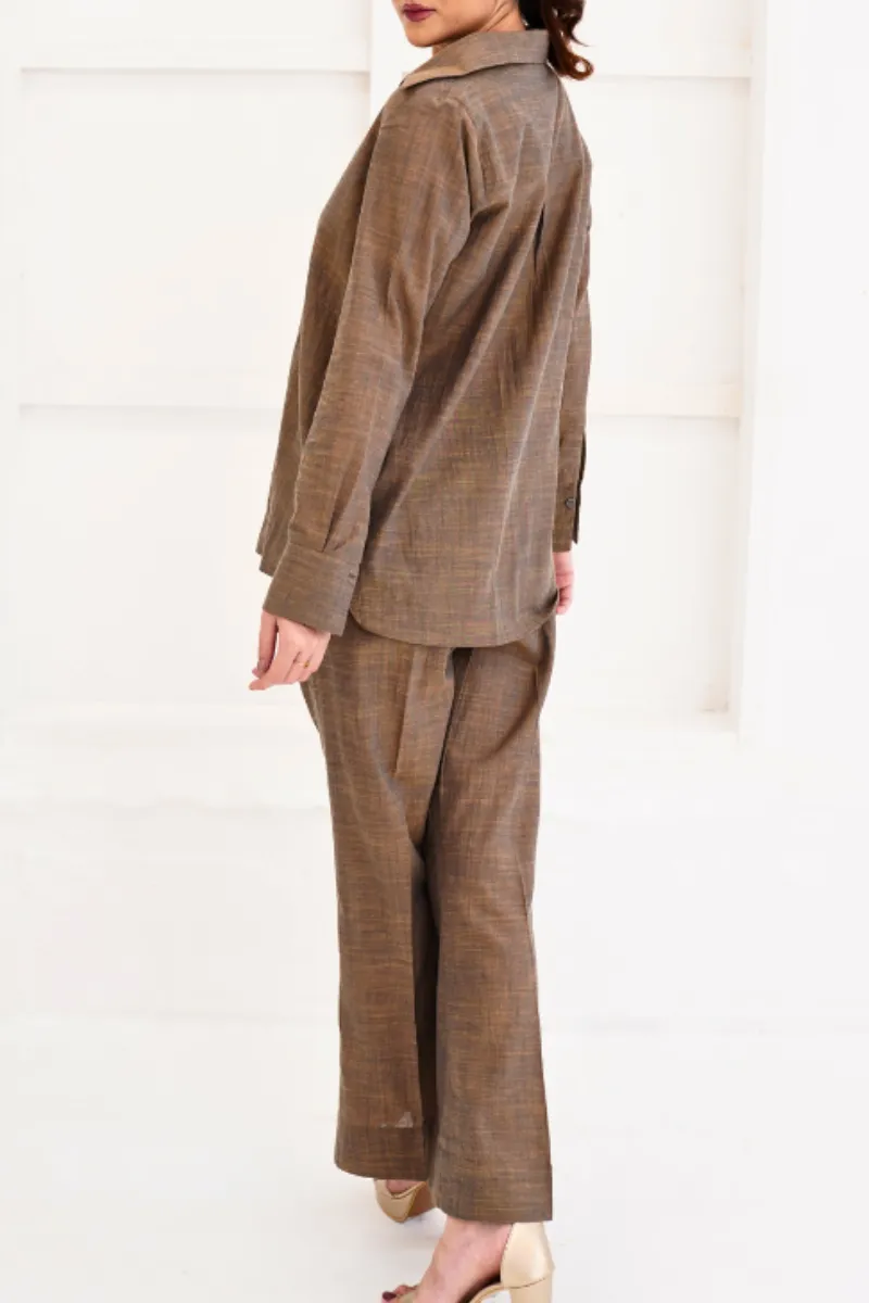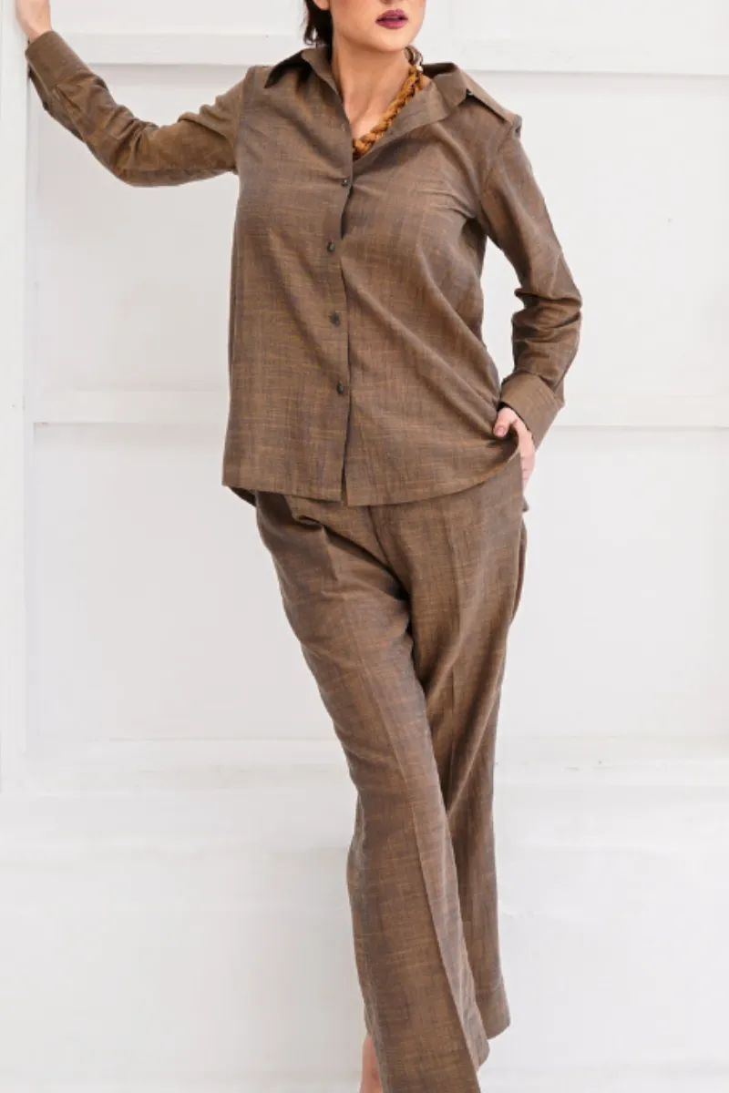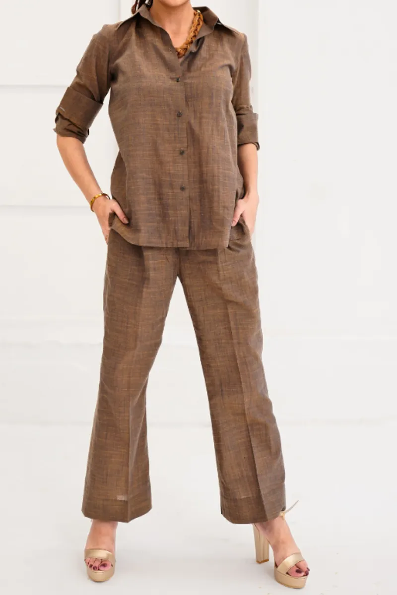 A sophisticated two-piece set featuring a structured button-up shirt and tailored straight-leg trousers. Designed for effortless elegance and versatility, crafted from breathable handwoven cotton.