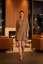 A refined knee-length dress paired with a structured jacket for a polished look. Designed with clean lines and breathable handwoven cotton, it blends timeless style with modern sensibility.