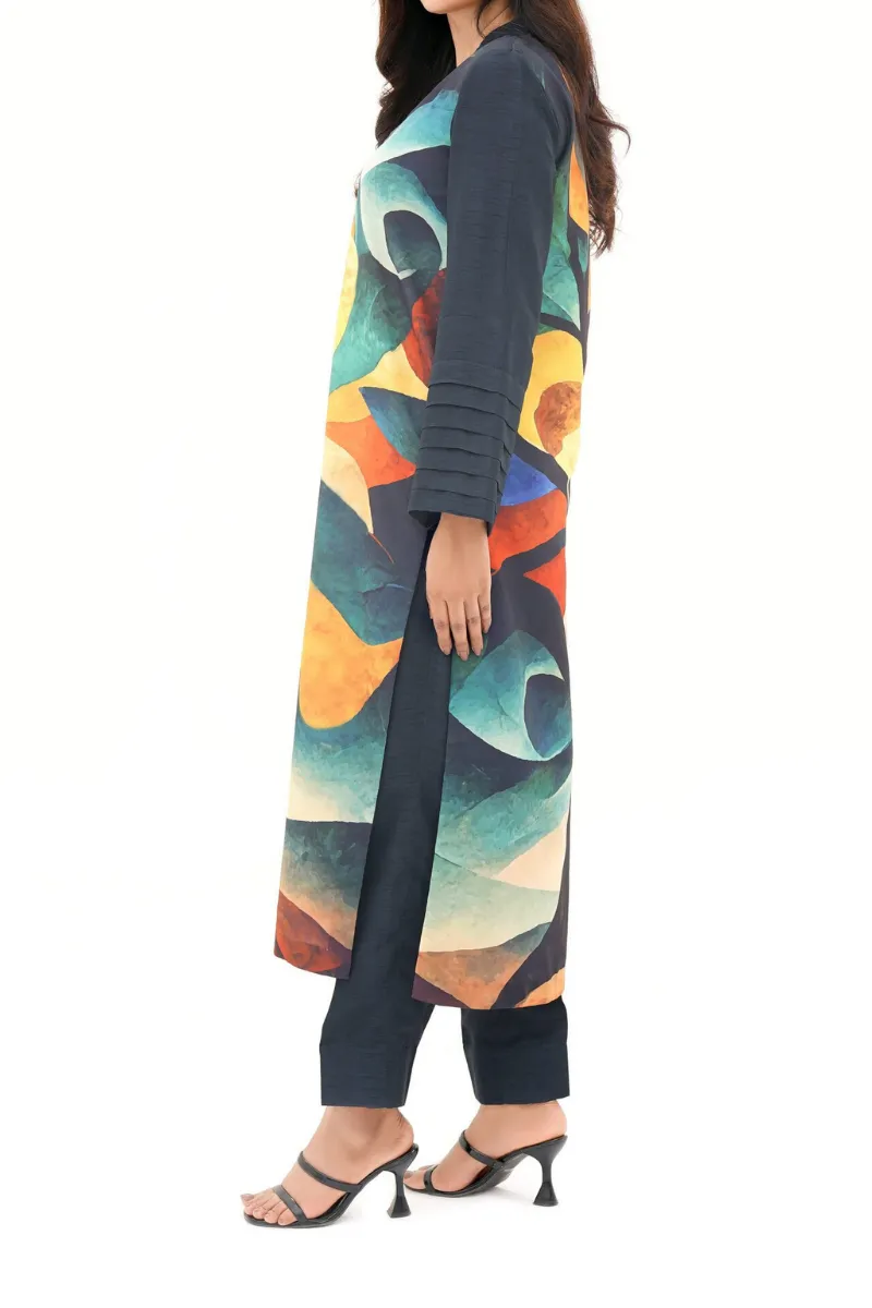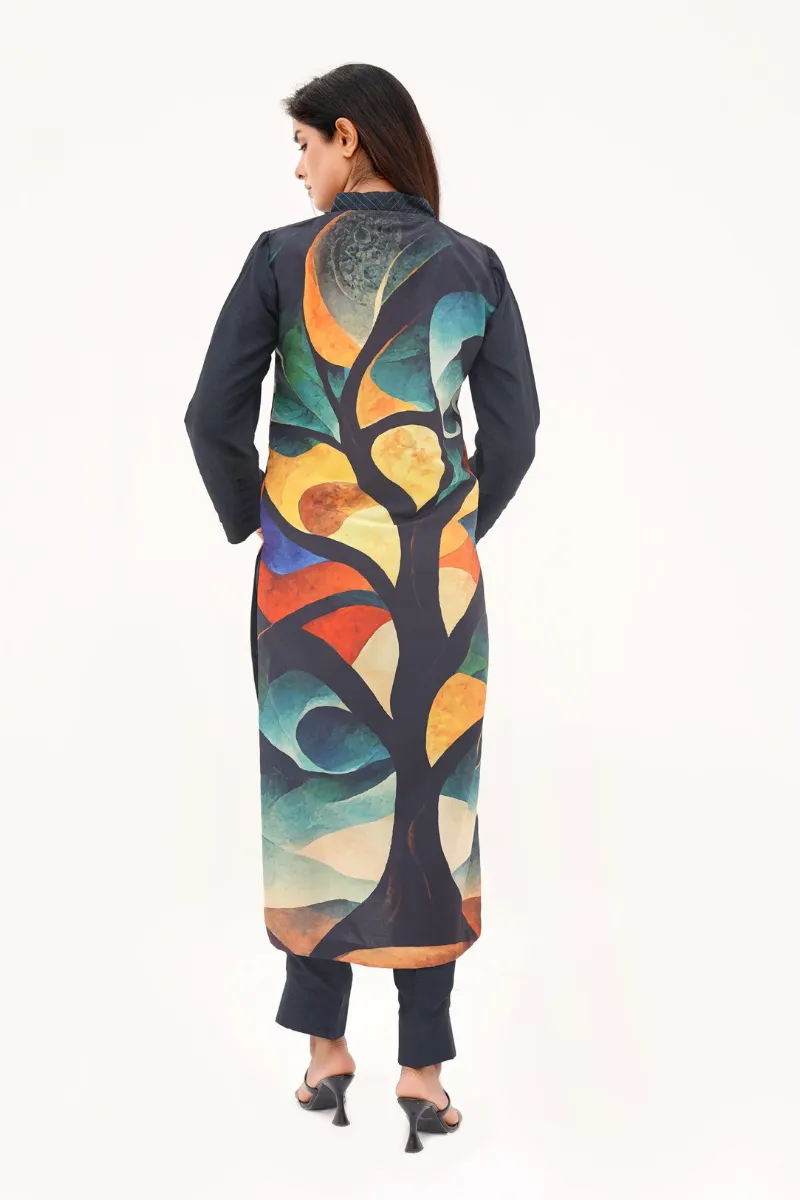 Rooted channels the enduring power of a tree’s roots — steady, unwavering, and full of life. Inspired by mural art that symbolizes flow and motion, this silk kurti features dynamic patterns in bold contrasts that echo the strength beneath the surface. The design reflects a modern woman’s balance between ambition and authenticity, perfectly paired with straight pant trousers for an elegant yet comfortable look. Rooted is made to move with you — whether in a boardroom or over a cup of chai — carrying your energy and spirit with quiet confidence.